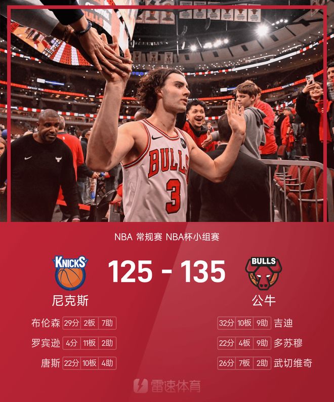 吉迪砍下生涯新高的32分外加10篮板9助攻,武切维奇26分7篮板,公牛击败尼克斯。