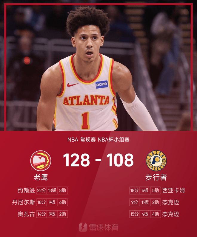 老鹰球员约翰逊砍下22分13篮板8助攻准三双,带领老鹰大胜步行者。